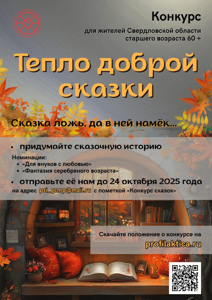 ГАУЗ СО «Областной центр общественного здоровья и медицинской профилактики» при поддержке Министерства здравоохранения Свердловской области объявляет о начале конкурса «Тепло доброй сказки». Мероприятие направлено на профилактику когнитивных и эмоциональных нарушений и пропаганду здорового образа жизни среди пожилых жителей региона.