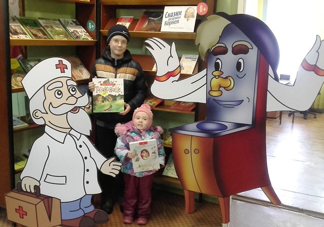 Кроме того, в библиотеке была организована фотозона «Чуковский с улыбкой». Дети и взрослые с большим удовольствием фотографировались рядом с любимыми героями из сказок Корнея Чуковского – Мойдодыром и Айболитом.