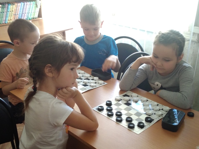Дошколята из детского сада пришли на праздник в библиотеку и узнали о том, как появилась игра в шашки, отвечали на вопросы викторины и отгадывали загадки. А затем ребята сражались на шахматном поле друг с другом.