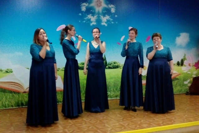 Концертная программа продолжилась выступлениями вокальных групп из Полевского «Рифей» и «Рио-рита». Эти творческие коллективы не первый раз приезжают в библиотеку, они умеют «зажигать» аудиторию, несмотря на лирический ретро-репертуар. От победителей многих песенных конкурсов не отставали и солисты камерного хора «Тонус» — клуб при библиотеке — верные читатели!