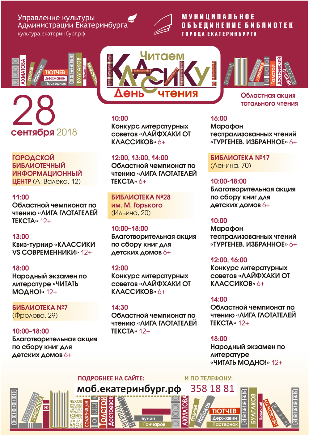 Подхватит эстафету Дня чтения квиз-турнир для интеллектуалов «Классики VS современники». Команды школьников продемонстрируют свой кругозор, логическое мышление и смекалку в интеллектуальном сражении по русской и зарубежной литературе. 7 туров по 3 вопроса в каждом не оставят игроков равнодушными: заставят разворошить ворох знаний и фактов и подарят незабываемые эмоции. К участию в турнире приглашаются учащиеся 8-11х классов, команды по 4-5 человек (допускается разновозрастной состав). В финале турнира определятся 3 команды-победителя, которые будут награждены призами и дипломами.