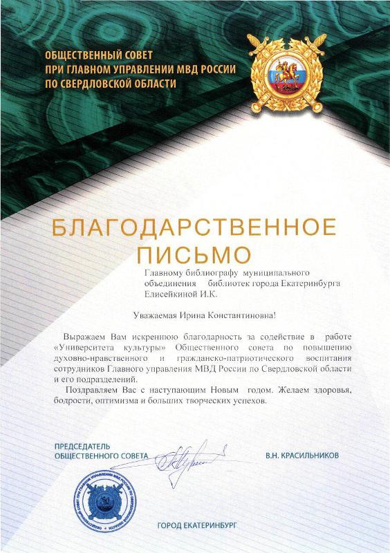 Стоит отметить, что Муниципальное объединение библиотек Екатеринбурга не первый раз сотрудничает с ГУ МВД по Свердловской области. И в преддверии Нового года Общественный совет при ГУ МВД по Свердловской области вручил благодарственные письма директору МОБ Елене Красновой, заведующей библиографического отдела Татьяне Гурьевой и главному библиографу Ирине Елисейкиной.
