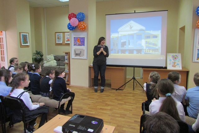 После небольшой фотовикторины «Театры Екатеринбурга» Наталия Александровна рассказала ребятам о Детской филармонии, ее истории, о кружках и студиях, о спектаклях, о традициях. И, конечно, о талисмане Детской филармонии – самом музыкальном уральском коте – Филармонике. К этой встрече в библиотеке был организован вернисаж рисунков музыкальных котов, и по этим рисункам ребята угадывали различные музыкальные инструменты.