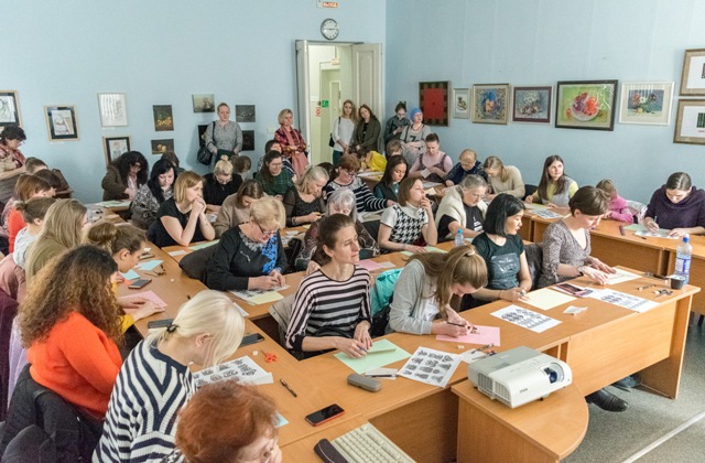 Оксана Мицник, художница и педагог, провела мастер-класс «Загадочный турецкий орнамент». Сначала она познакомила с популярными элементами и деталями, цветами, а затем под ее пошаговым руководством каждый нарисовал мандалу в черно-белом варианте. А уже дома люди смогут ее раскрасить по своему желанию.