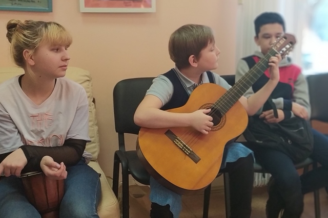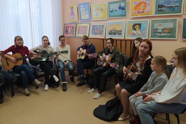 Сразу 9 акустических гитар и 17 звонких голосов звучали в уютной гостиной библиотеки №40. Музыкальная программа для ребят из клуба «Ровесник» и ДШИ №5 был наполнен бардовскими, рок-песнями и хорошим настроением.