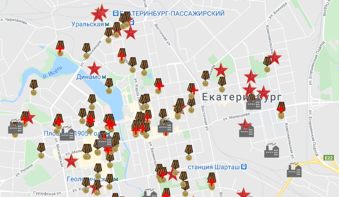 В годы Великой Отечественной войны Свердловск (Екатеринбург) был одной из крупнейших в стране кузниц оружия для фронта. Тысячи свердловчан геройски сражались на фронтах с немецко-фашистскими захватчиками. Об этом напоминают нам мемориальные доски и памятники. Познакомиться с ними можно на интерактивной карте «Имена Победы на карте Екатеринбурга». К историческому Дню города, который отмечается 18 ноября, специалисты МОБ дополнили карту, разместив на ней госпитали, заводы и фабрики.