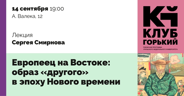 14 сентября в 19:00 в библиотеке на Антона Валека,12 пройдет очередная лекция рамках проекта «Клуб Горький» на тему «Европеец на Востоке: образ «другого» в эпоху Нового времени». Ее прочитает Сергей Смирнов, доктор исторических наук, профессор кафедры востоковедения УрФУ.
