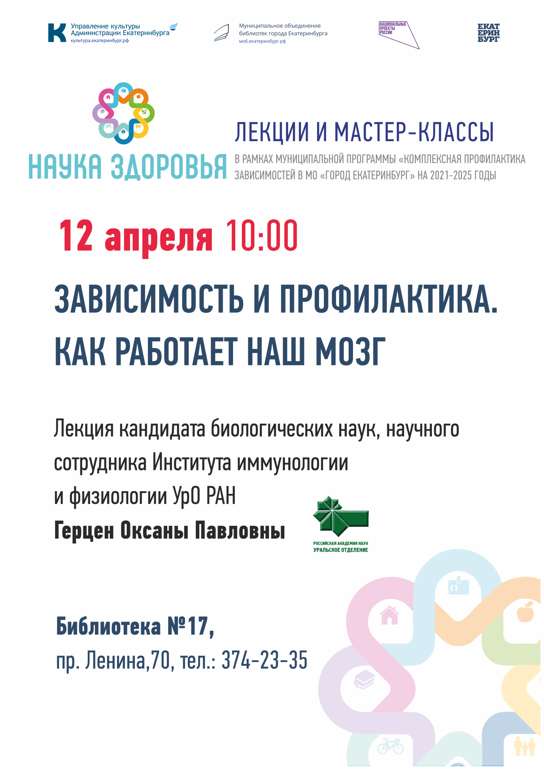 12 апреля в 10:00 в библиотеке №17 (пр. Ленина,70) в рамках проекта «Наука здоровья» пройдет лекция «Зависимость и профилактика. Как работает наш мозг?». Спикер — Оксана Герцен Оксана, кандидат биологических наук, научный сотрудник Института иммунологии и физиологии УрО РАН.