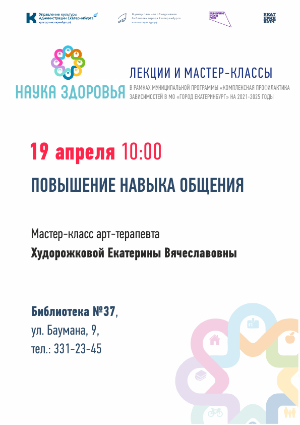 19 апреля в 10:00 в библиотеке №37 (ул. Баумана,9) в рамках проекта «Наука здоровья» пройдет мастер-класс «Повышение навыка общения». Спикер — арт-терапевт Екатерина Худорожкова.