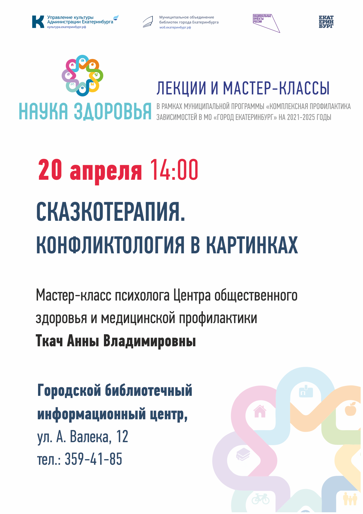 20 апреля в 14:00 в библиотеке на Антона Валека,12 в рамках проекта «Наука здоровья» пройдет мастер-класс «Сказкотерапия. Конфликтология в картинках». Спикер — Анна Ткач, клинический психолог Регионального центра общественного здоровья и медицинской профилактики.