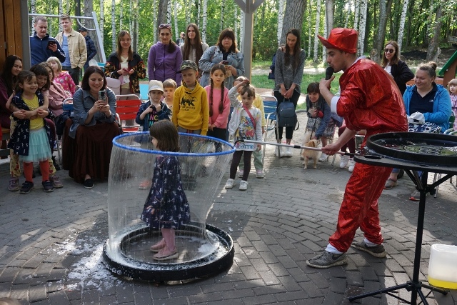 Бурю детских эмоций вызвало шоу мыльных пузырей и крио-шоу, которыми завершалась работа площадки. Очаровательный ведущий ловко шутил, играя с детьми, не забывал подключать родителей, удивлял спецэффектами и простыми законами физики. Ребята «попробовали» жидкий азот, буквально зажигали, уменьшали предметы и разбивали живые розы.