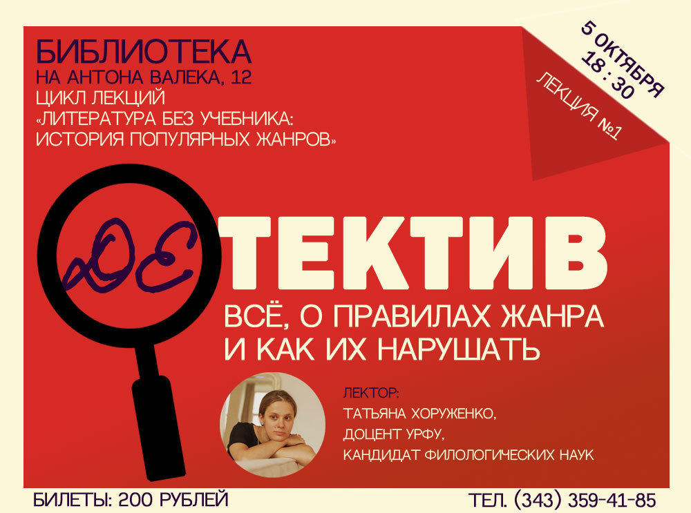 5 октября 18:30 в Городском библиотечном информационном центре (Антона Валека, 12) стартует авторский цикл лекций кандидата филологических наук Татьяны Хоруженко «Литература без учебника: история популярных жанров»! С октября 2022 по февраль 2023 года вас ожидают 5 лекций, посвящённых самым популярным жанрам в литературе: