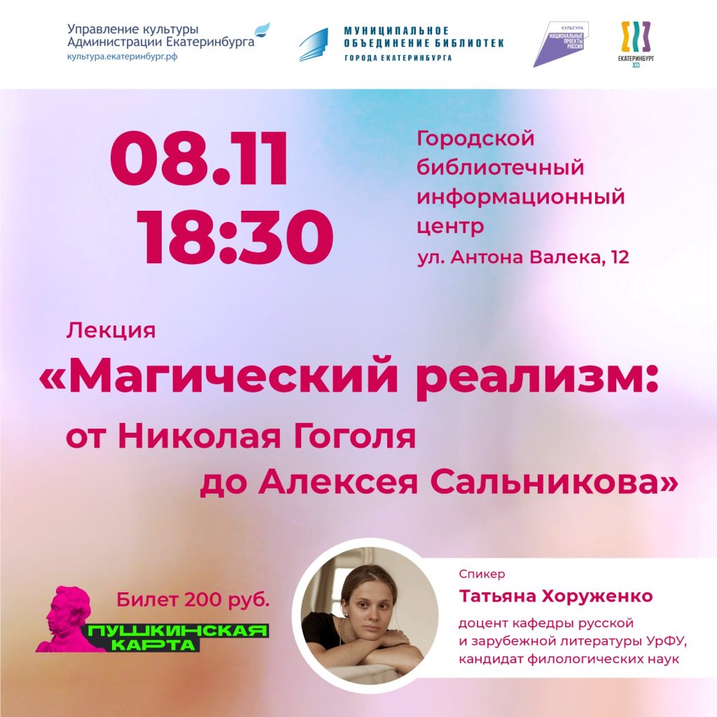 8 ноября 18:30 в библиотеке на Антона Валека, 12 состоится лекция филолога Татьяны Хоруженко «Магический реализм: от Николая Гоголя до Алексея Сальникова».