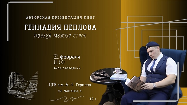 В библиотеке им. А.И. Герцена (ул. Чапаева,5) 21 февраля в 11:00 пройдет авторская презентация поэтических сборников Геннадия Пеплова.Геннадий Пеплов (г. Карпинск, Свердловская область) — автор трех поэтических сборников: «Два ангела», «Мое дыхание» и «Мечта ангела». Многие стихи посвящены семье, дружбе и, конечно же, России. Он успешно сочетает работу в службе безопасности крупной нефтяной компании и написание лирических сборников. Поэт черпает свою энергию и вдохновение из путешествий, наверное, именно поэтому его стихи получаются настолько живыми и тонкими.Поэтическая встреча позволит окунуться в мир поэзии, насладиться чарующими стихами и узнать больше о творчестве Геннадия Пеплова. Стихи начинающего поэта отличаются глубиной мысли, эмоциональностью и гармонией. Они способны перенести вас в иные миры, пробудить внутренние чувства и вызвать множество эмоций.Автор расскажет о писательских буднях, поделится личным рецептом вдохновения. Помимо лирических произведений, Геннадий Пеплов обращается к теме силы духа. Сам поэт профессионально занимается спортом (бодибилдингом и армрестлингом) и активно призывает своих читателей вести здоровый образ жизни. Любит путешествовать и параллельно активному отдыху проводит презентации своих книг. В настоящее время работает над выходом четвёртого сборника стихов.Вход свободныйЧапаева, 5257-84-06