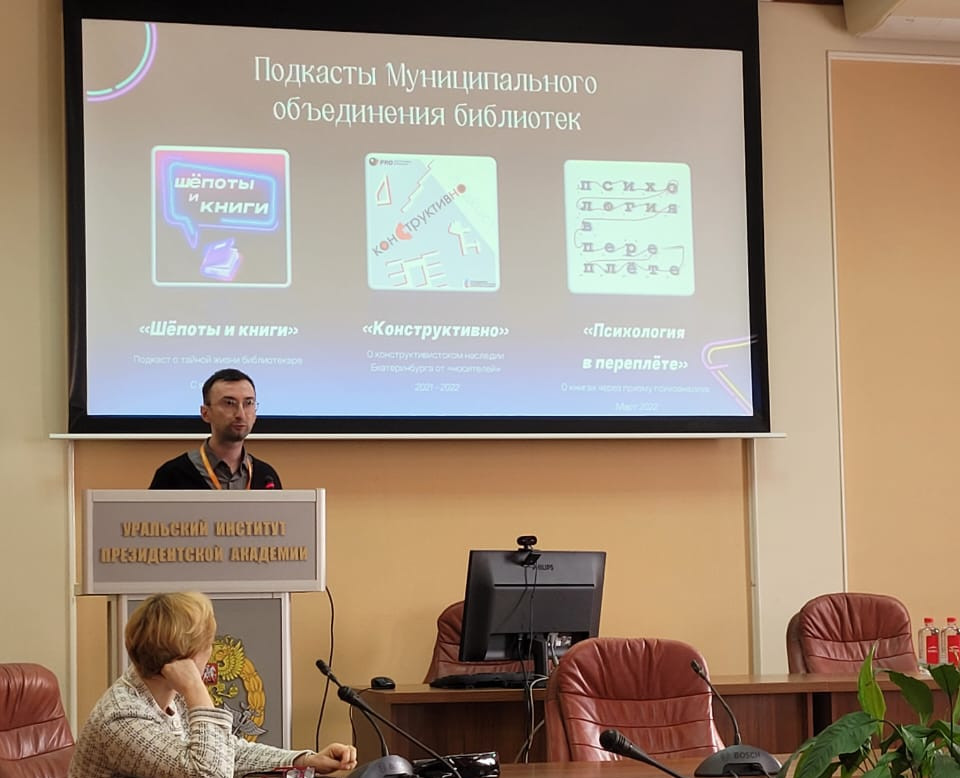 Руслан Евгеньевич Хисамутдинов, заведующий сектором по продвижению библиотечных услуг в сети Интернет представил доклад на тему «Подкасты как медиаресурс для работы с аудиторией в сфере креативных индустрий». В своем докладе он напомнил о значимости использования новых медиаформатов в работе библиотек для привлечения аудитории и продвижения культурных и просветительских проектов.
