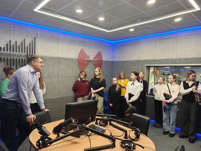 Встретил юных журналистов Сергей Храмушин, руководитель радиостанций «Радио России», «Маяк» и «Вести. FM».