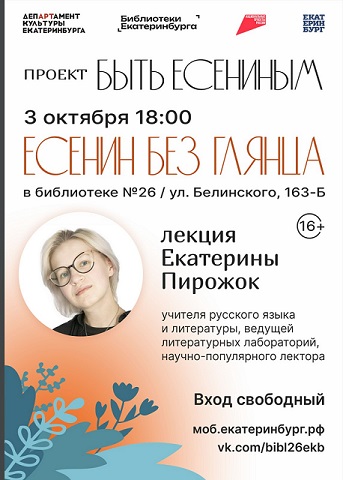 В библиотеке Екатерина Пирожок прочтёт лекцию, где вы услышите неожиданные и живые истории о Сергее Есенине. Как произвести фурор в легендарной «Бродячей собаке» без ущерба для кошелька? Как жить с женой, если вы буквально говорите на разных языках? Какие ещё тайны хранит биография московского хулигана?